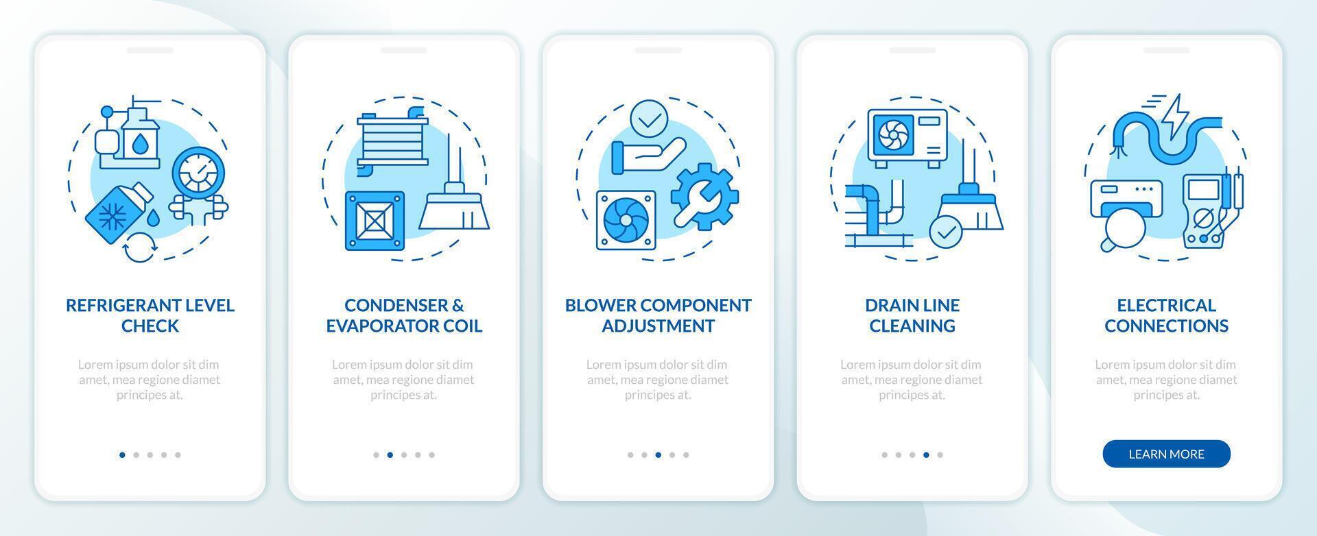 Air conditioning inspection blue onboarding mobile app screen. Walkthrough 5 steps editable graphic instructions with linear concepts. UI, UX, GUI template Pro Vector