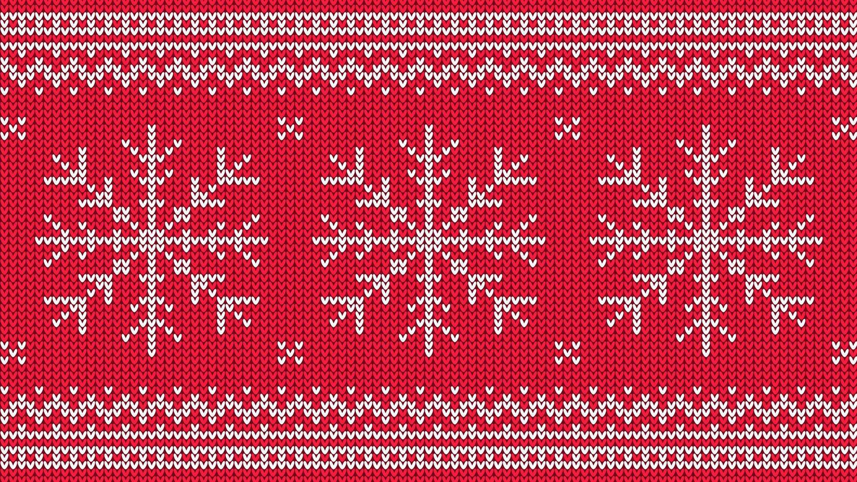 Knitted pattern with white snowflake and ornamental border on red background. Pro Vector