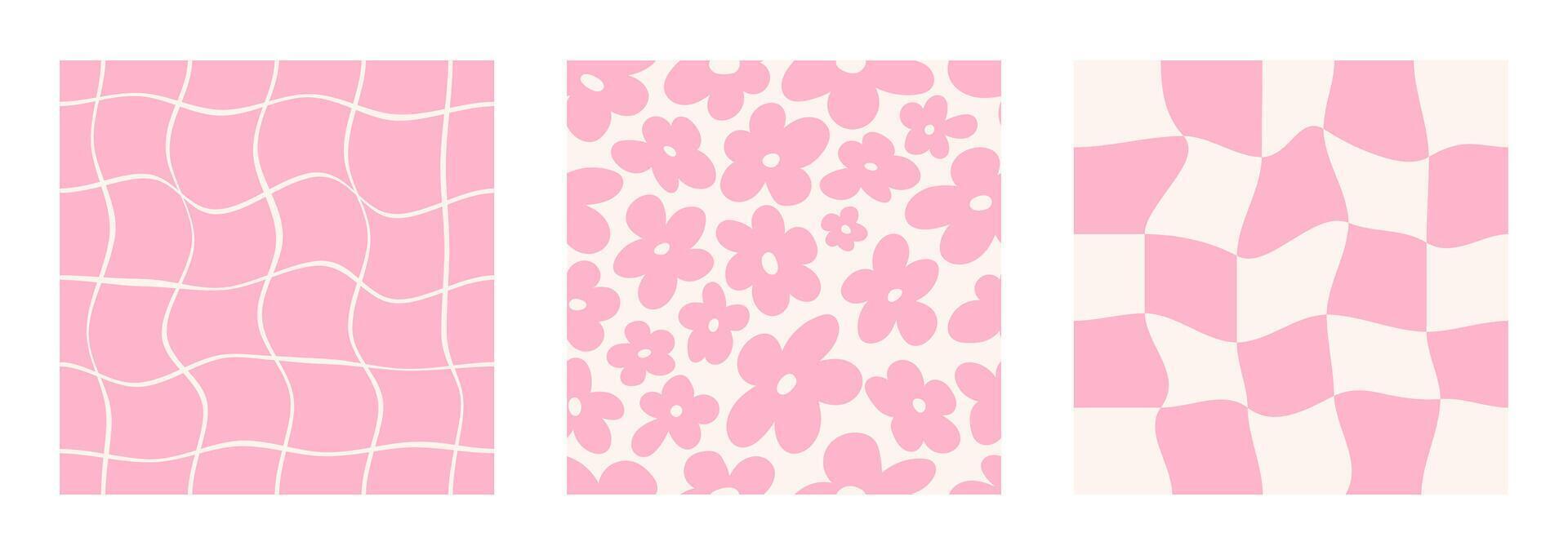 2000s pattern. Abstract flowers. A distorted pink checkerboard. Set of seamless patterns in pastel shades. Y2k Aesthetics Pro Vector