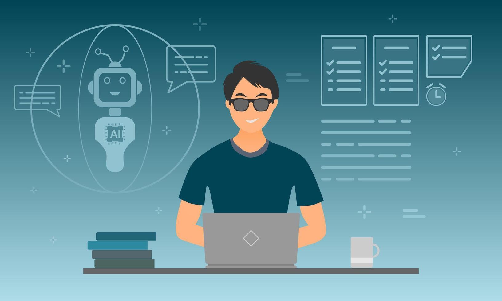 A man working on a laptop with virtual screen of artificial intelligence robot or chatbot technology concept. Pro Vector