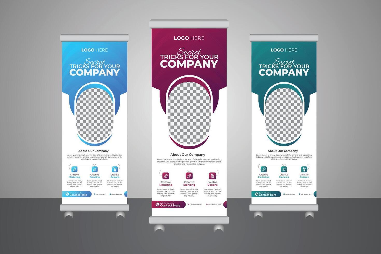 Innovative business roll-up banner design with a round layout, a geometric triangle, and an x-banner design template for exhibition ads Pro Vector