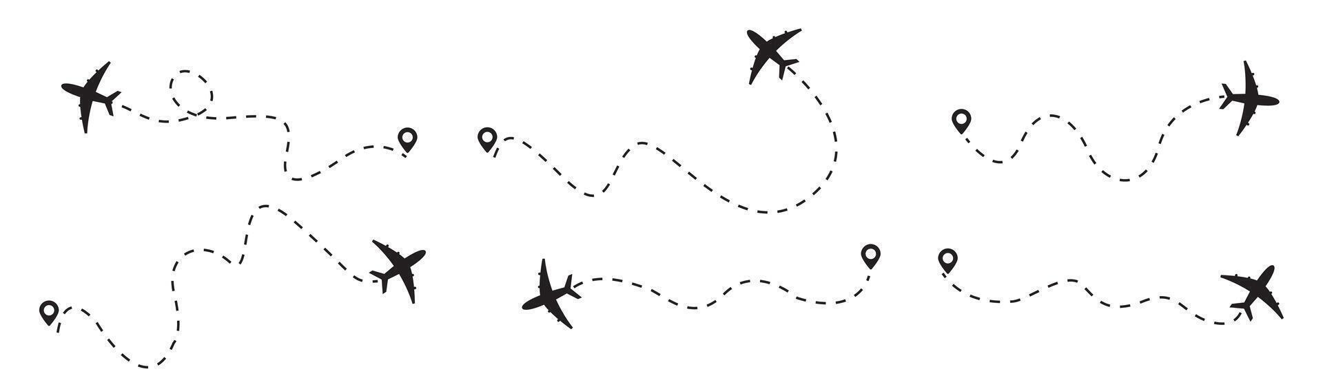 Airplane Plane routes line set Planes dotted flight pathway. Plane paths. Aircraft tracking, planes, travel, map pins, location pins .start point line trace and plane routes Pro Vector