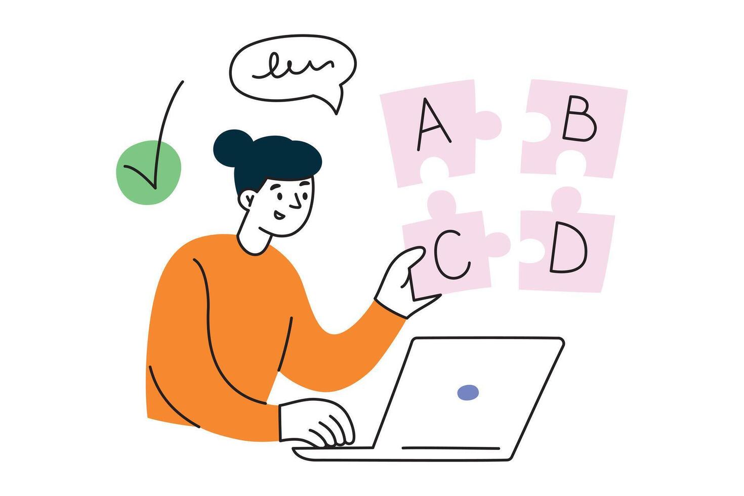 Person working on a project, learning on laptop, creating a presentation or report, online exam composition, flat cartoon girl with computer, illustration of passing test on internet Pro Vector