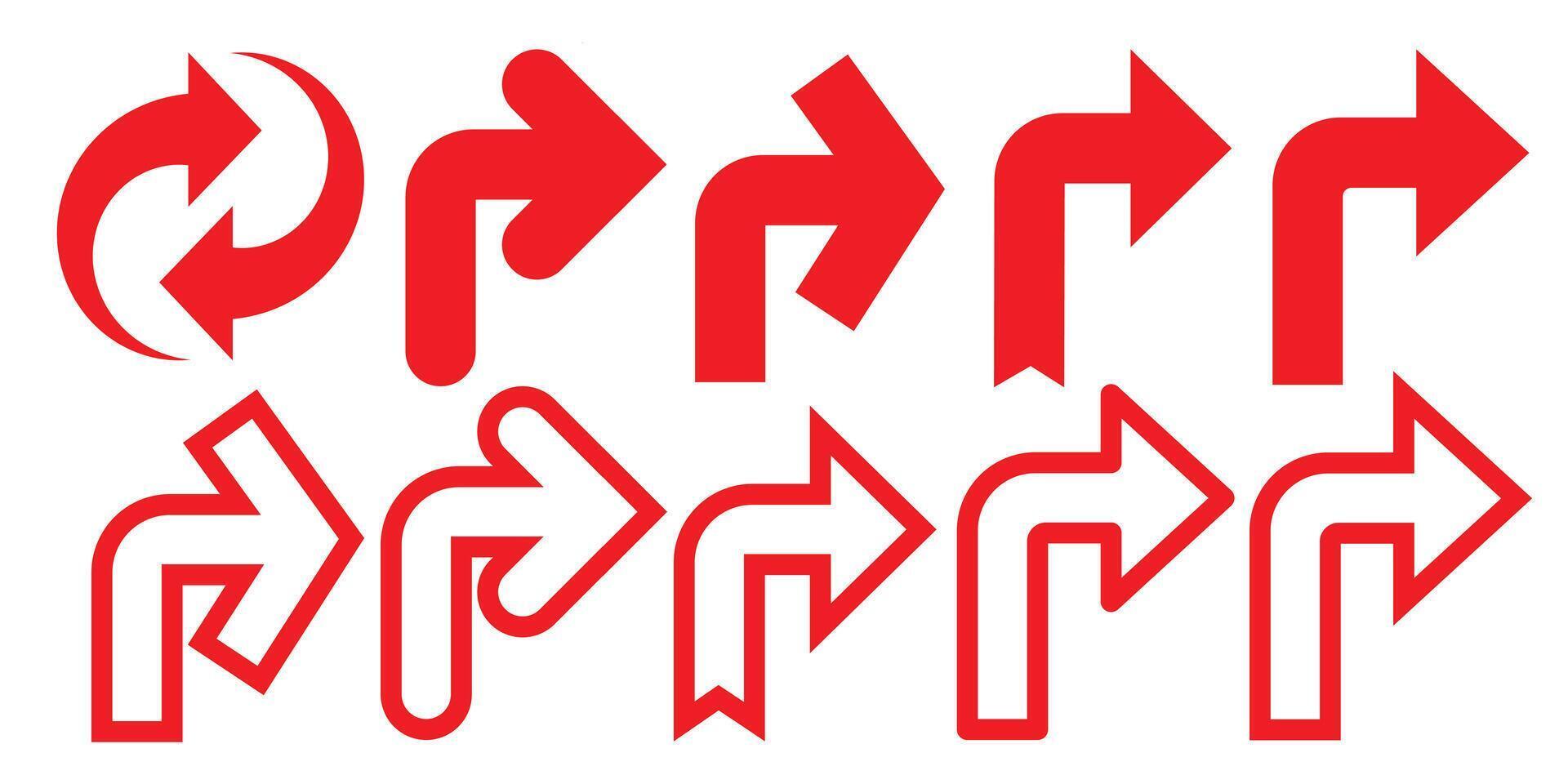 Red arrows direction right. Set pointer shapes for design element purpose. vector