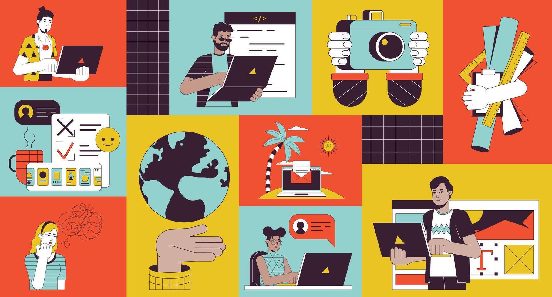 Remote working bento grid illustration set. Nomad laptop, notebook typing teleworkers 2D image collage design graphics collection. Multicultural freelancers flat characters moodboard layout Pro Vector