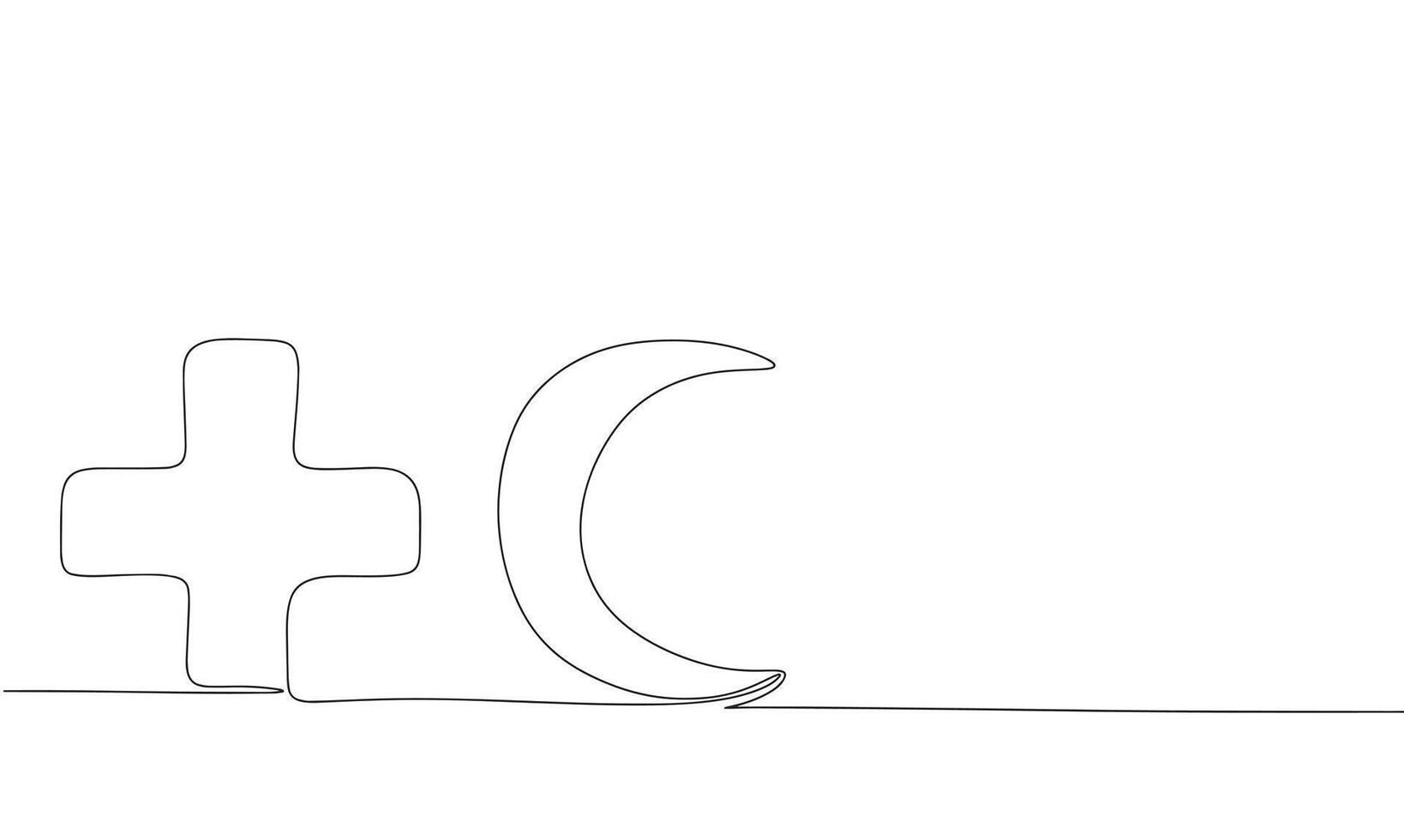Cross and moon one line continuous. Cross and crescent line art. Hand drawn art. Pro Vector