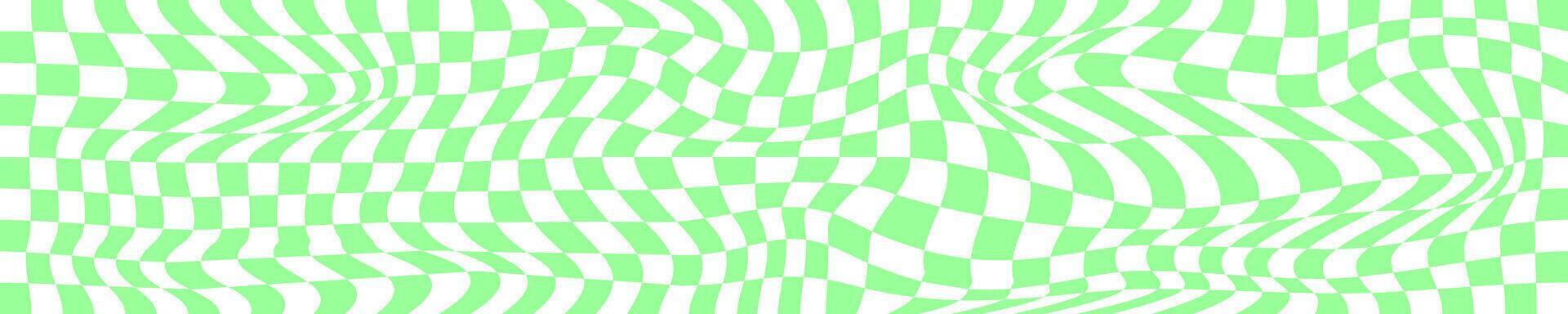 Psychedelic pattern with warped green and white squares. Distorted chess board background. Checkered optical illusion. Crazy geometric design. Trippy checkerboard surface. Pro Vector