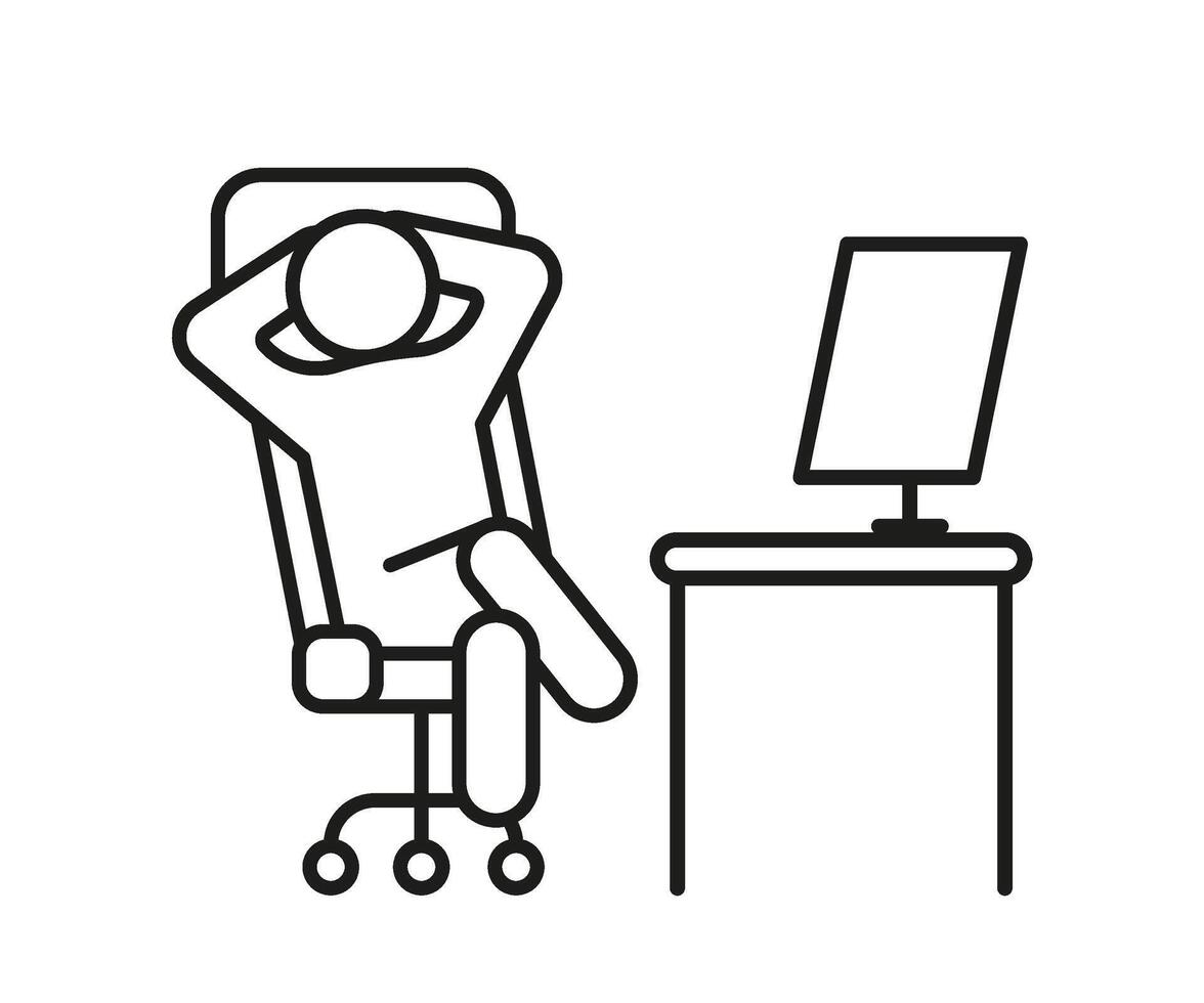 Person relax on work chair on computer, line icon. Man rest on workplace, calm on chair. Lazy tired person, break time. illustration Pro Vector