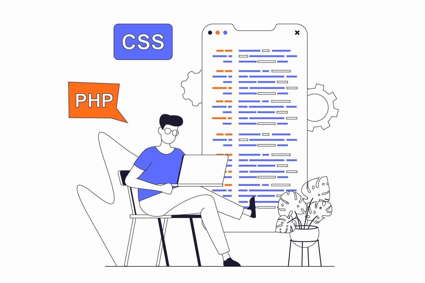 Programmers working concept with people scene in flat outline design. Man developer works with code, fixes bug and creates mobile application. illustration with line character situation for web Pro Vector