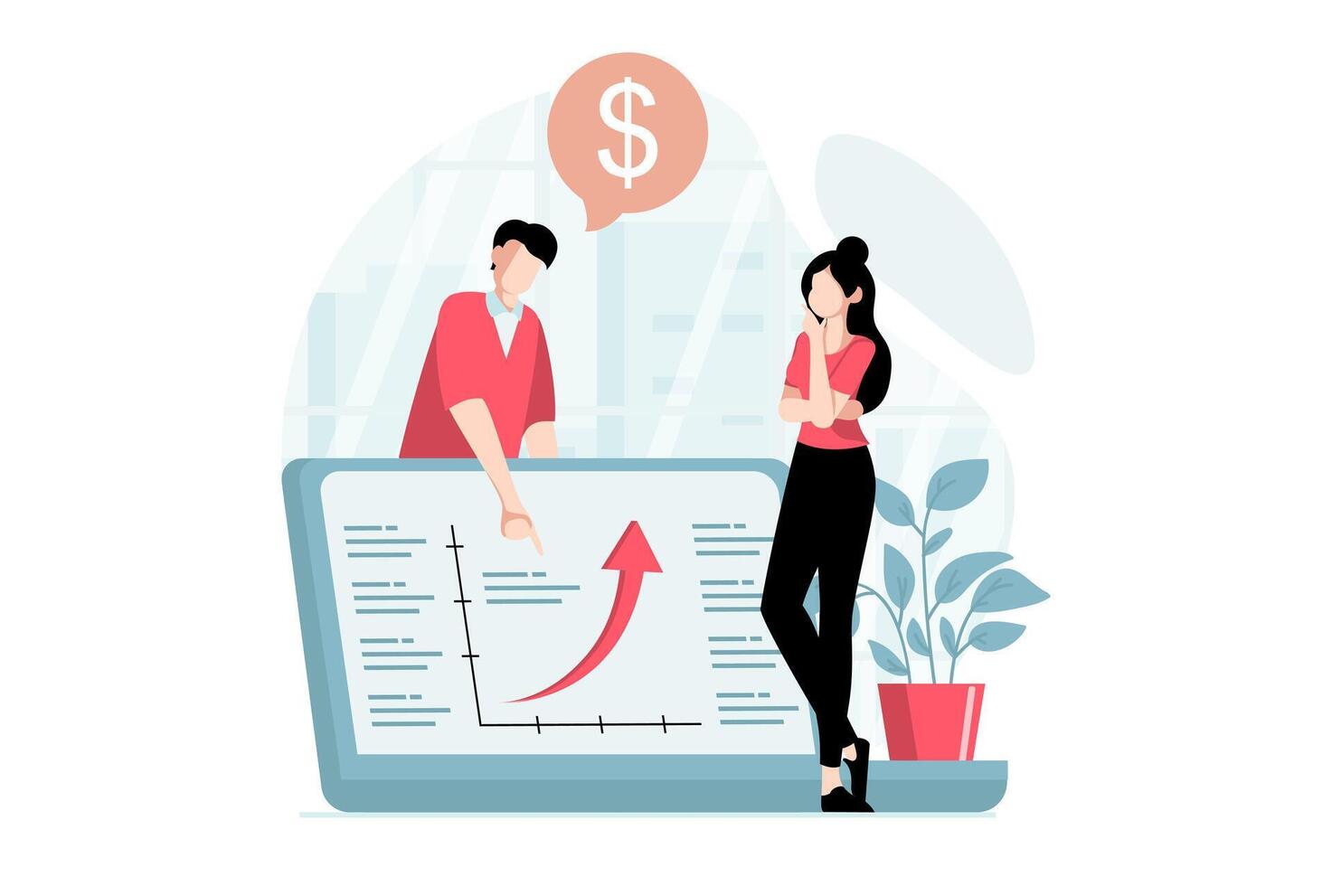 Data analysis concept with people scene in flat design. Man and woman studying statistics, working with graph with arrow and fixing profit growth. illustration with character situation for web Pro Vector