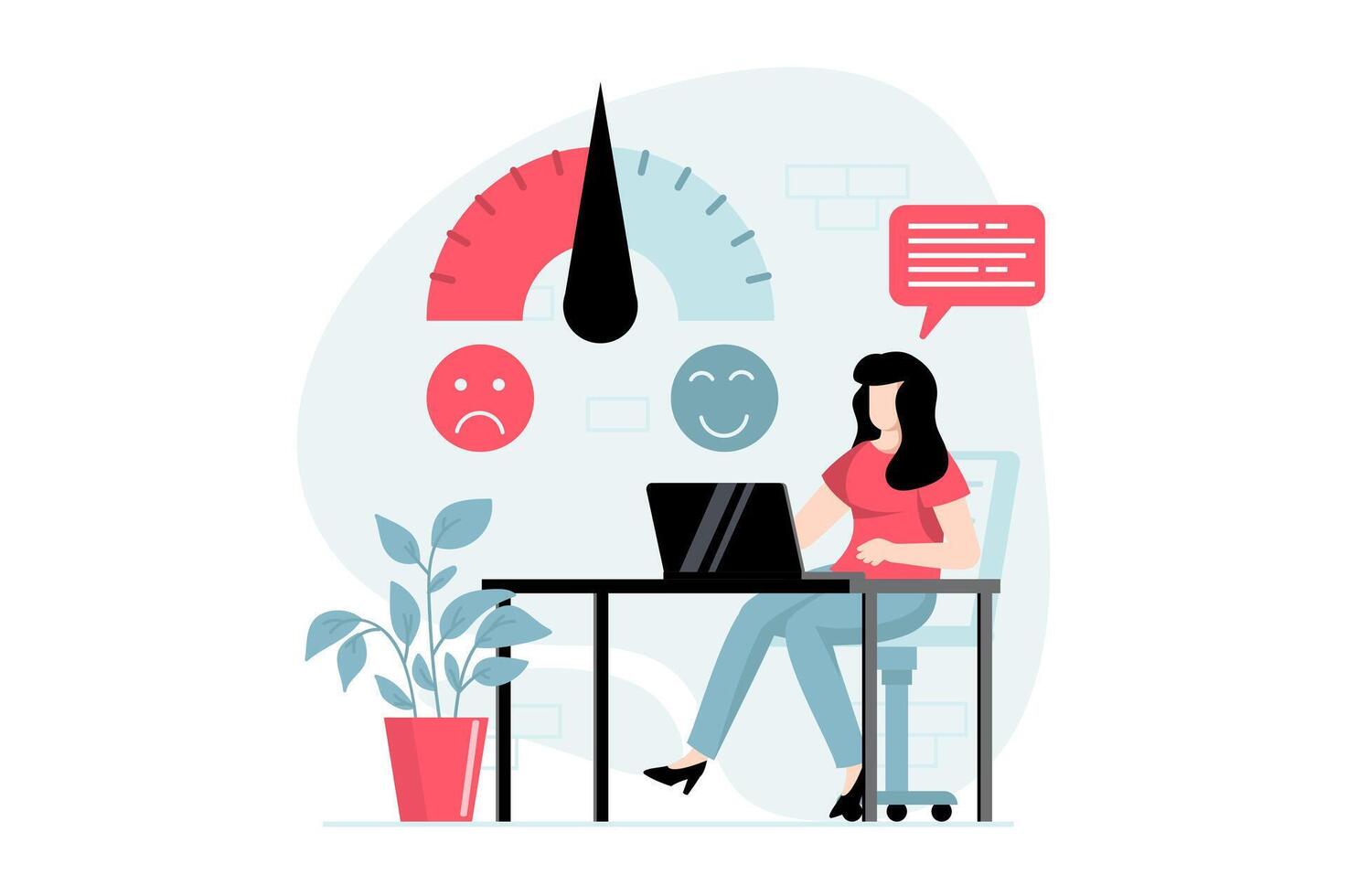 Feedback page concept with people scene in flat design. Woman shares user experience and leaves rating evaluation using different emoticons. illustration with character situation for web Pro Vector