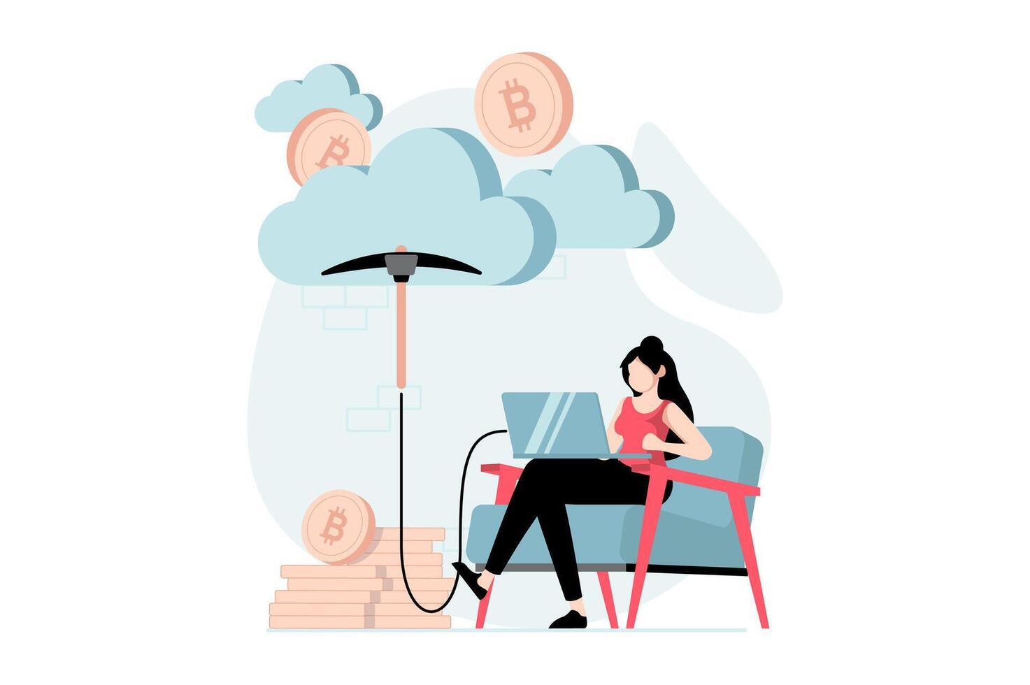 Cryptocurrency mining concept with people scene in flat design. Woman miner mines bitcoin and other crypto coins using laptop and cloud computing. illustration with character situation for web Pro Vector