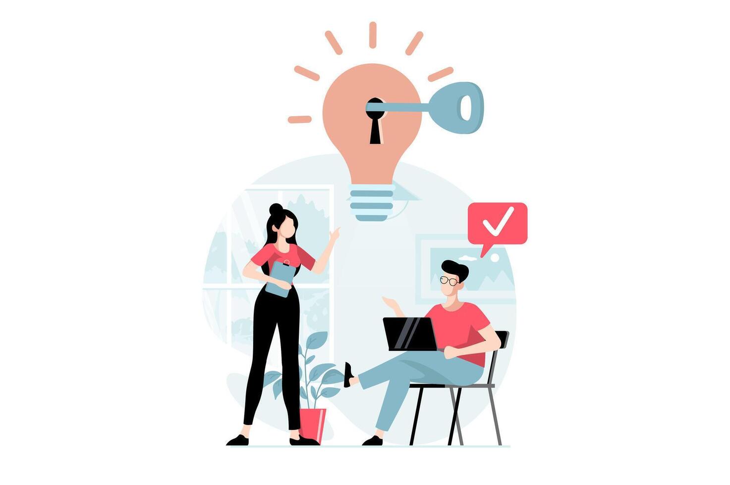Finding solution concept with people scene in flat design. Woman and man discuss, brainstorm and generate new ideas with project innovations. illustration with character situation for web Pro Vector