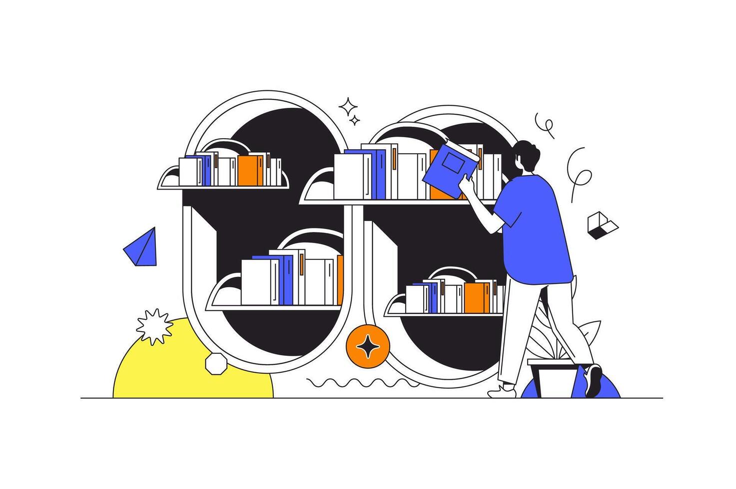 Cloud library web concept in flat outline design with character. Man reading e-books and storage on laptop using cloud technology. Online education and e-learning, people scene. illustration. Pro Vector