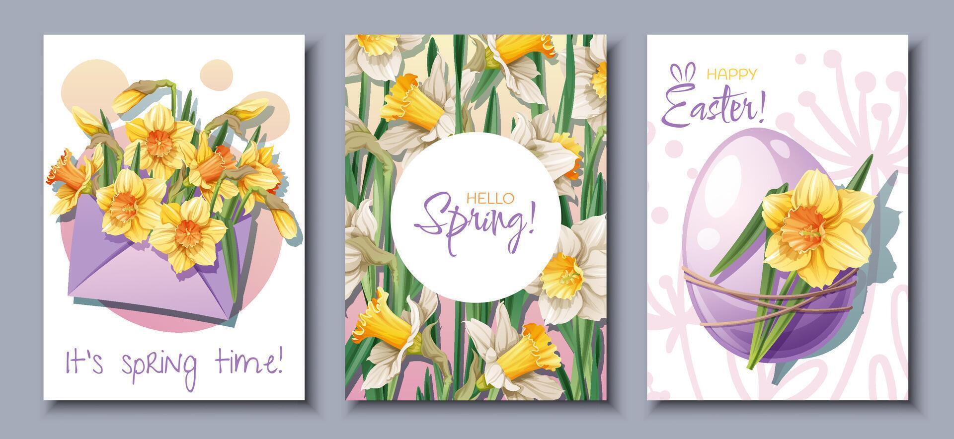 Set of greeting card templates with spring flowers for Easter. Poster, banner with daffodils in an envelope, with an Easter egg. Hello spring. illustration of delicate flowers in cartoon style Pro Vector