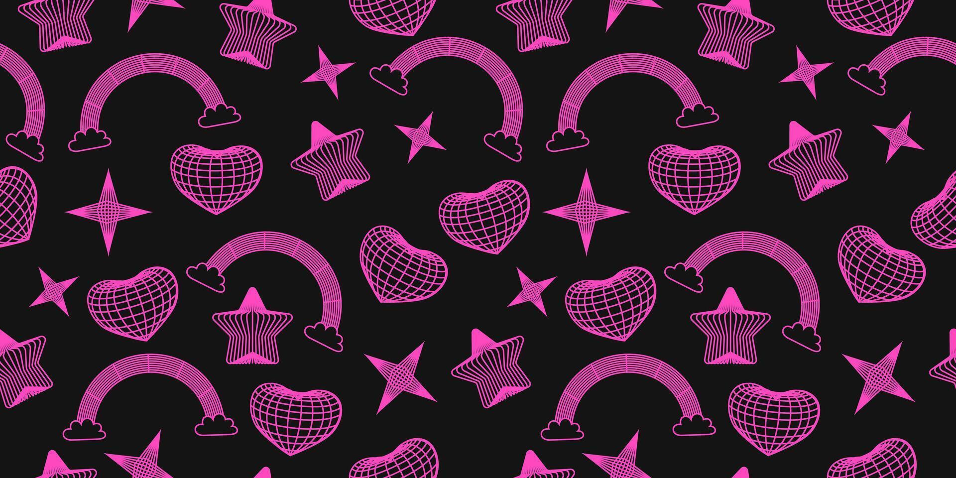 Seamless pattern with pink wireframe hearts, stars, rainbow with clouds on black background. Cyberpunk style texture with geometry grid. Y2K retro wave. 2000s psychedelic rave style. Pro Vector