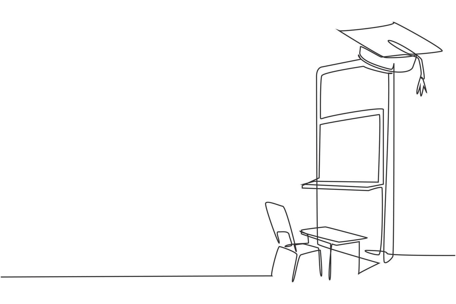 Single continuous line drawing empty study chairs and desks facing smartphone screen in which there is blackboard and graduation cap on top. Dynamic one line draw graphic design vector illustration Pro Vector