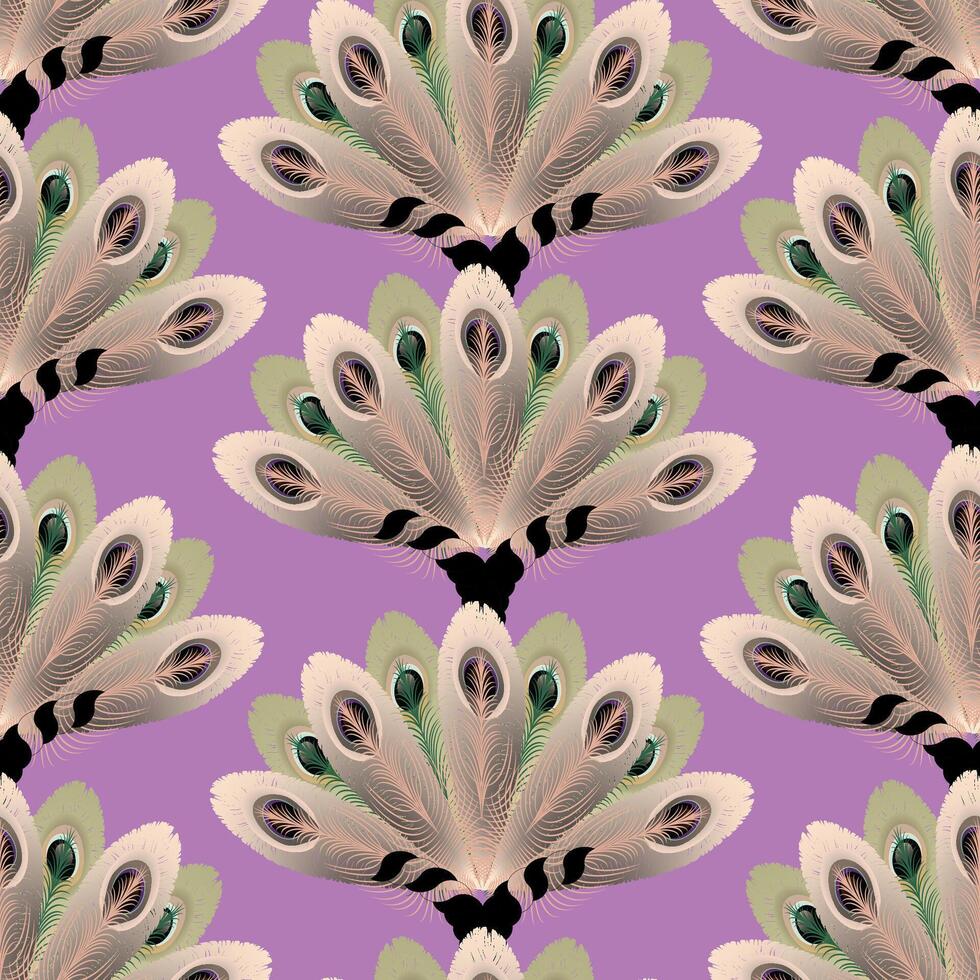 The magnificent peacock feathers are simplified to basic geometric shapes and lines that repeat in the fan motif. seamless, vertical minimalist surface pattern on lavender background. Pro Vector