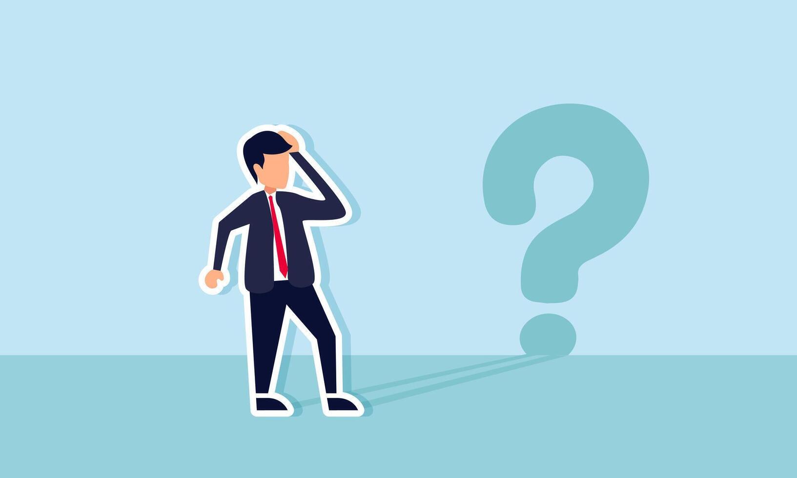 Confused and uncertain, seeking lifes meaning, searching for answers amid self doubt, concept of Curious businessman gazes at his shadow, shaped like a question mark Pro Vector