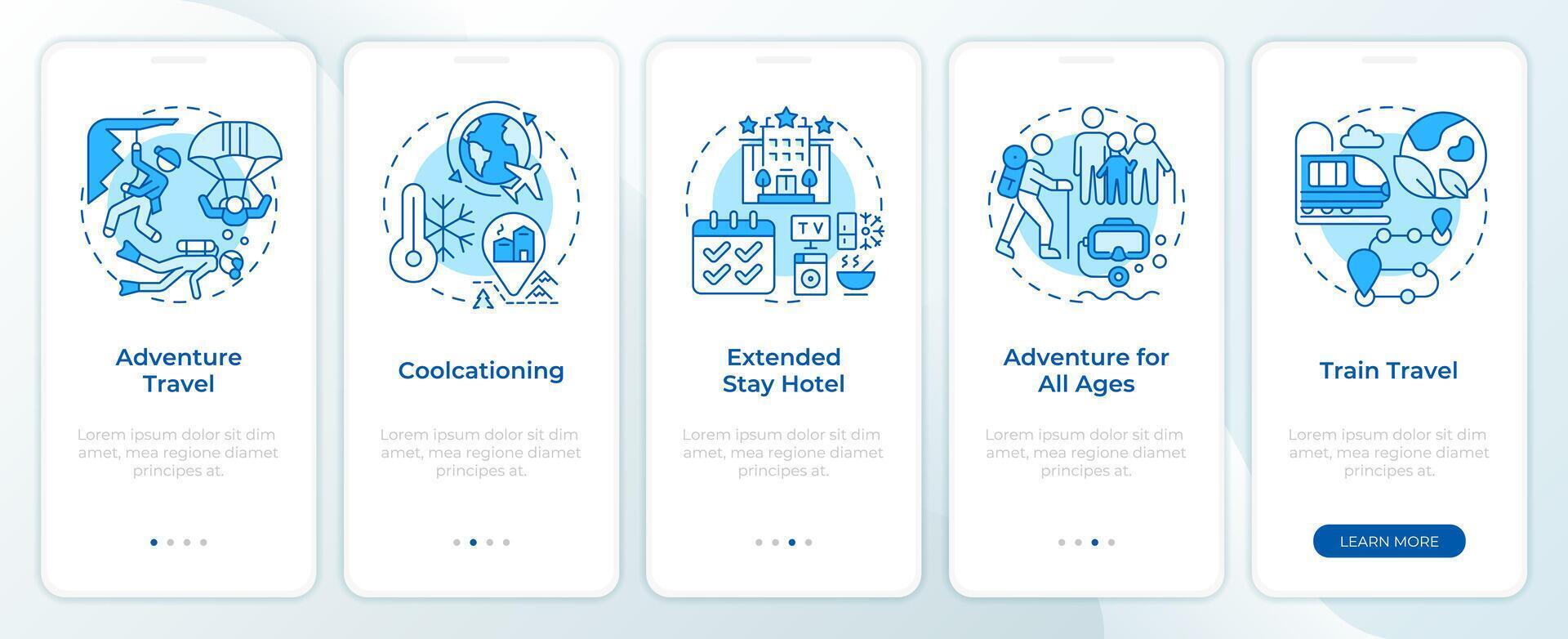 Trends in traveling blue onboarding mobile app screen. Walkthrough 5 steps editable graphic instructions with linear concepts. UI, UX, GUI template Pro Vector