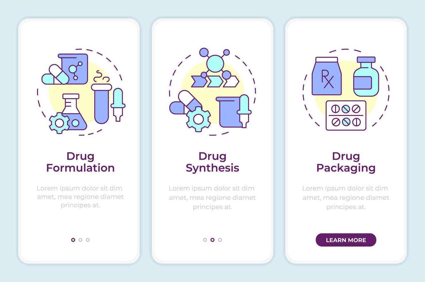 Drug manufacturing onboarding mobile app screen. Walkthrough 3 steps editable graphic instructions with linear concepts. UI, UX, GUI template Pro Vector