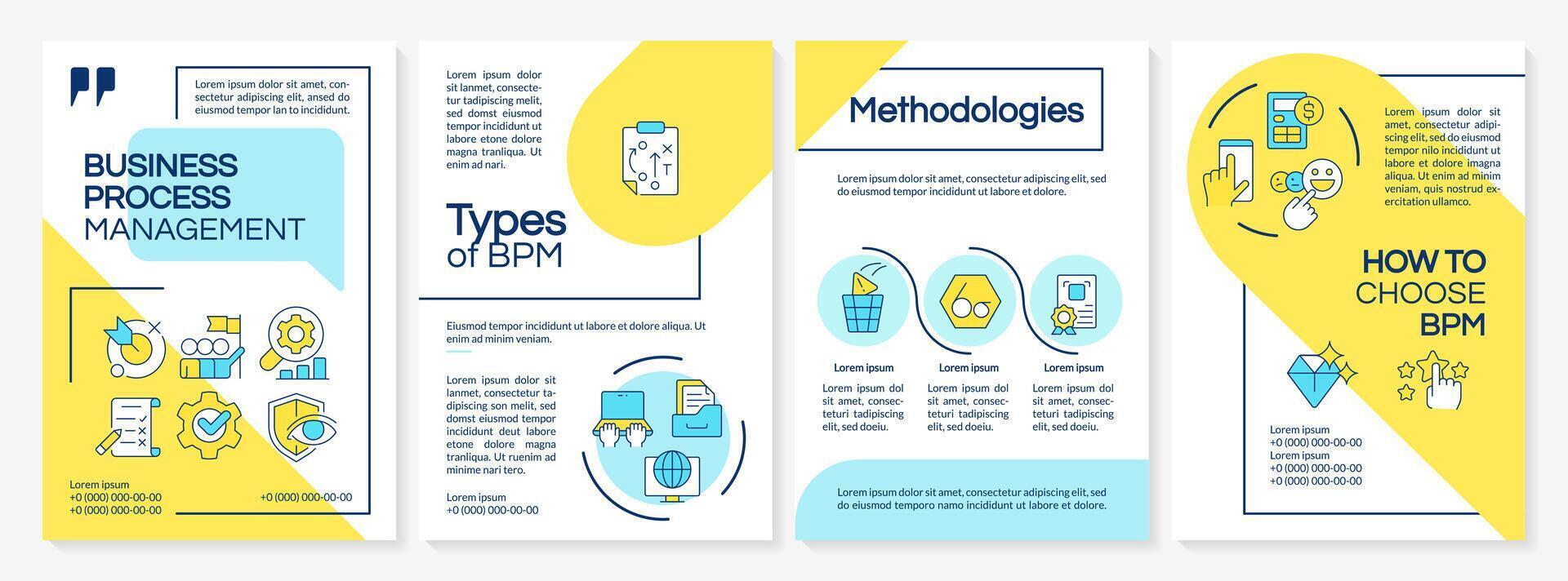 BPM methodologies organization blue and yellow brochure template. Leaflet design with linear icons. Editable 4 layouts for presentation, annual reports Pro Vector