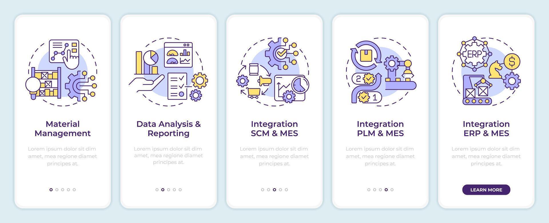 MES manufacturing organization onboarding mobile app screen. Walkthrough 5 steps editable graphic instructions with linear concepts. UI, UX, GUI template Pro Vector