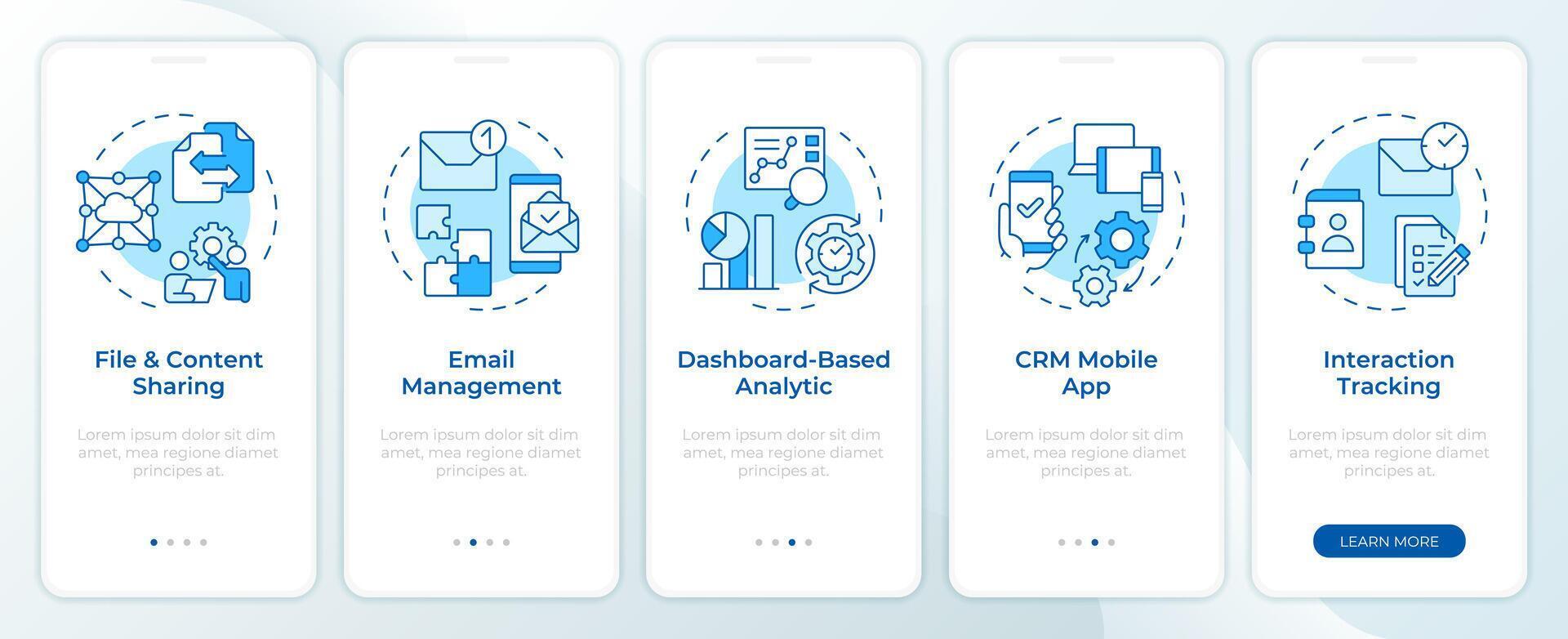 CRM organizational benefits blue onboarding mobile app screen. Walkthrough 5 steps editable graphic instructions with linear concepts. UI, UX, GUI template Pro Vector