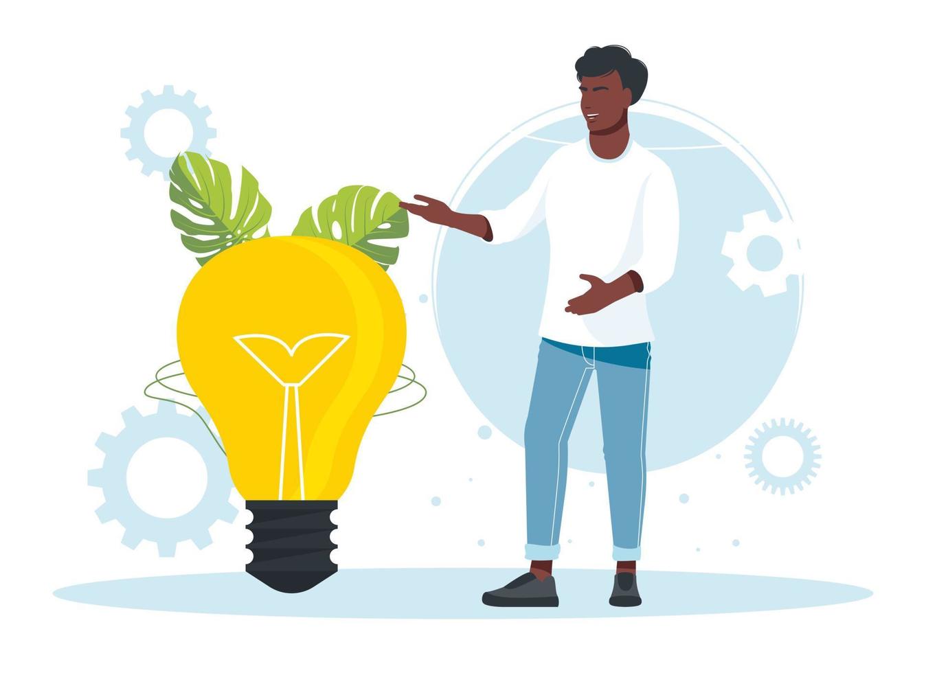 African man stands by a large light bulb. Business idea concept isolated. Creation, implementation of business innovations. Vector illustration. Implementation, integration of innovative ideas concept Pro Vector