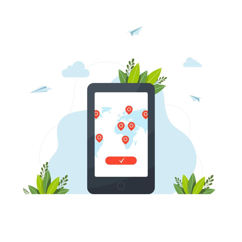 smartphone with map and geolocation points. Smartphone With Destination Mark, Gps Navigations. Navigation concept illustration with Location Marker. Telephone GPS.User geolocation. Vector illustration Pro Vector