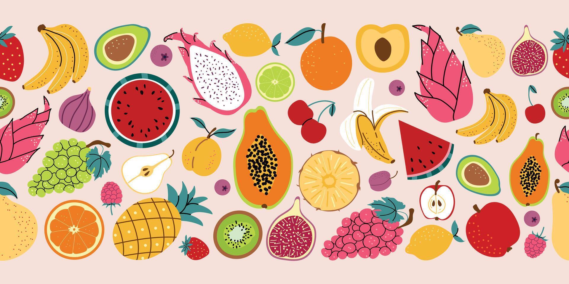 Seamless fruit background. Large collection of different fruits and berries. Banana, kiwi, pineapple, pear, lemon, avocado. illustration. Horizontal banner with isolated background. Pro Vector