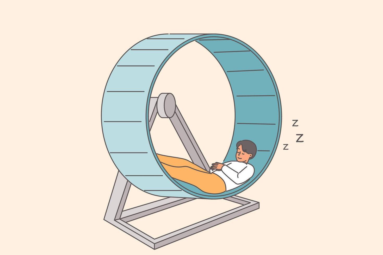Man sleeps on hamster wheel after professional burnout caused by routine, uninteresting work Pro Vector