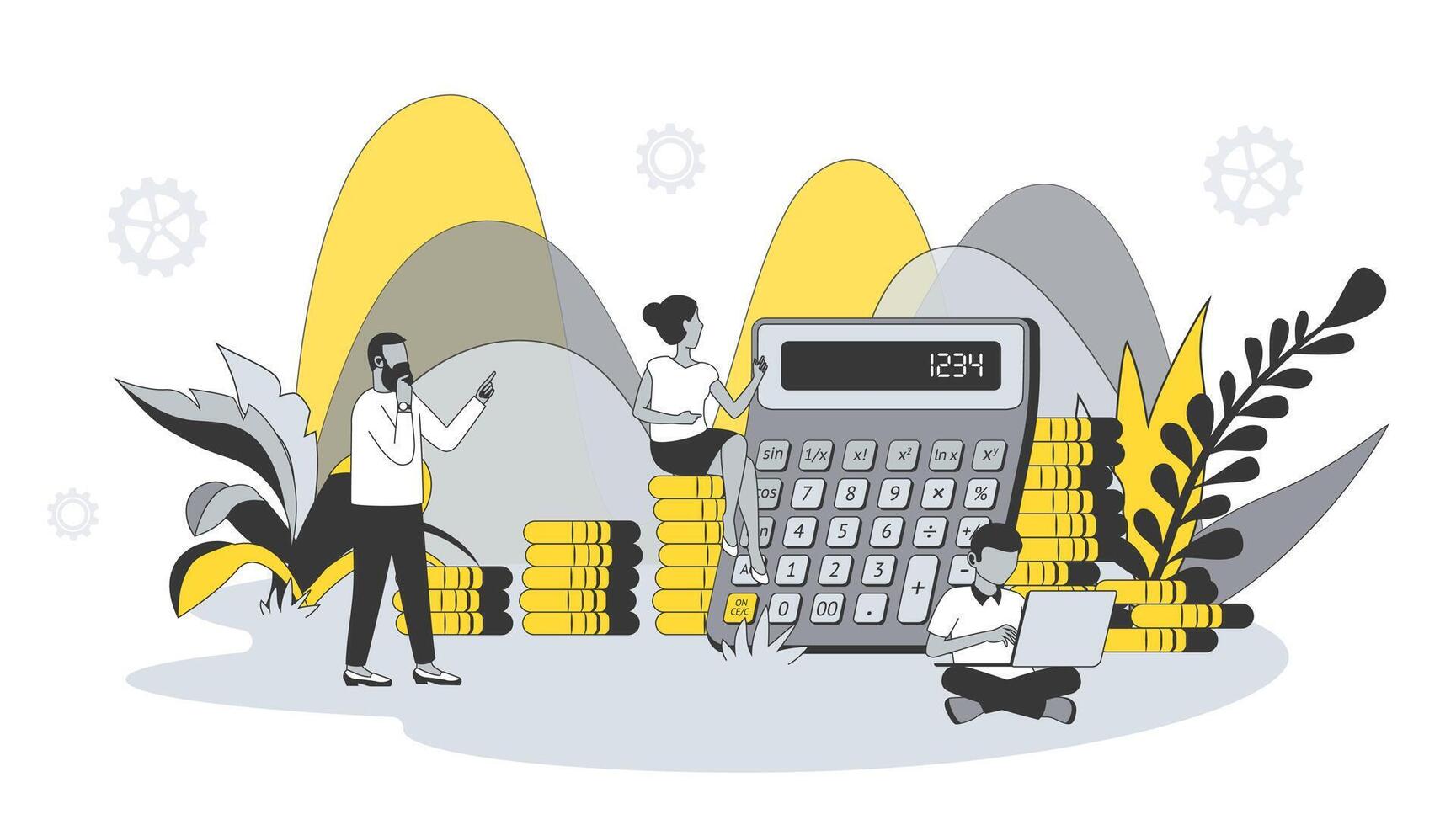 Business statistic concept in flat design with people. Man and woman calculating and analyze financial data, accounting and earnings money. illustration with character scene for web banner Pro Vector