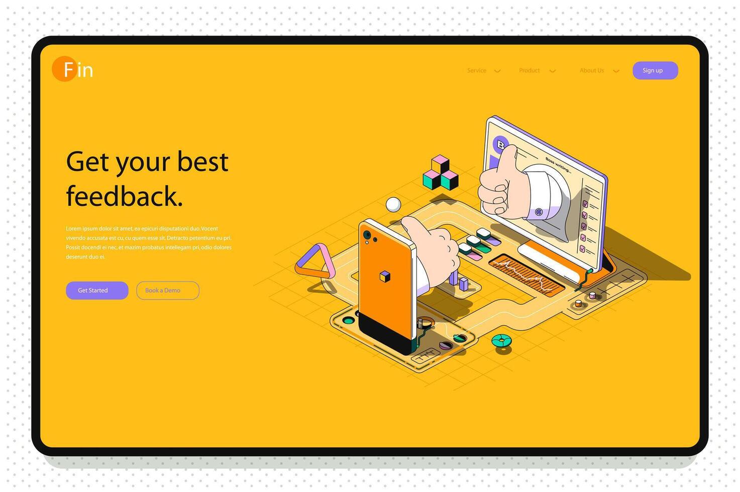 Feedback concept 3d isometric outline landing page. Clients leave high rating, likes. Users comments with good experience, positive quality. web illustration with abstract line composition. Pro Vector