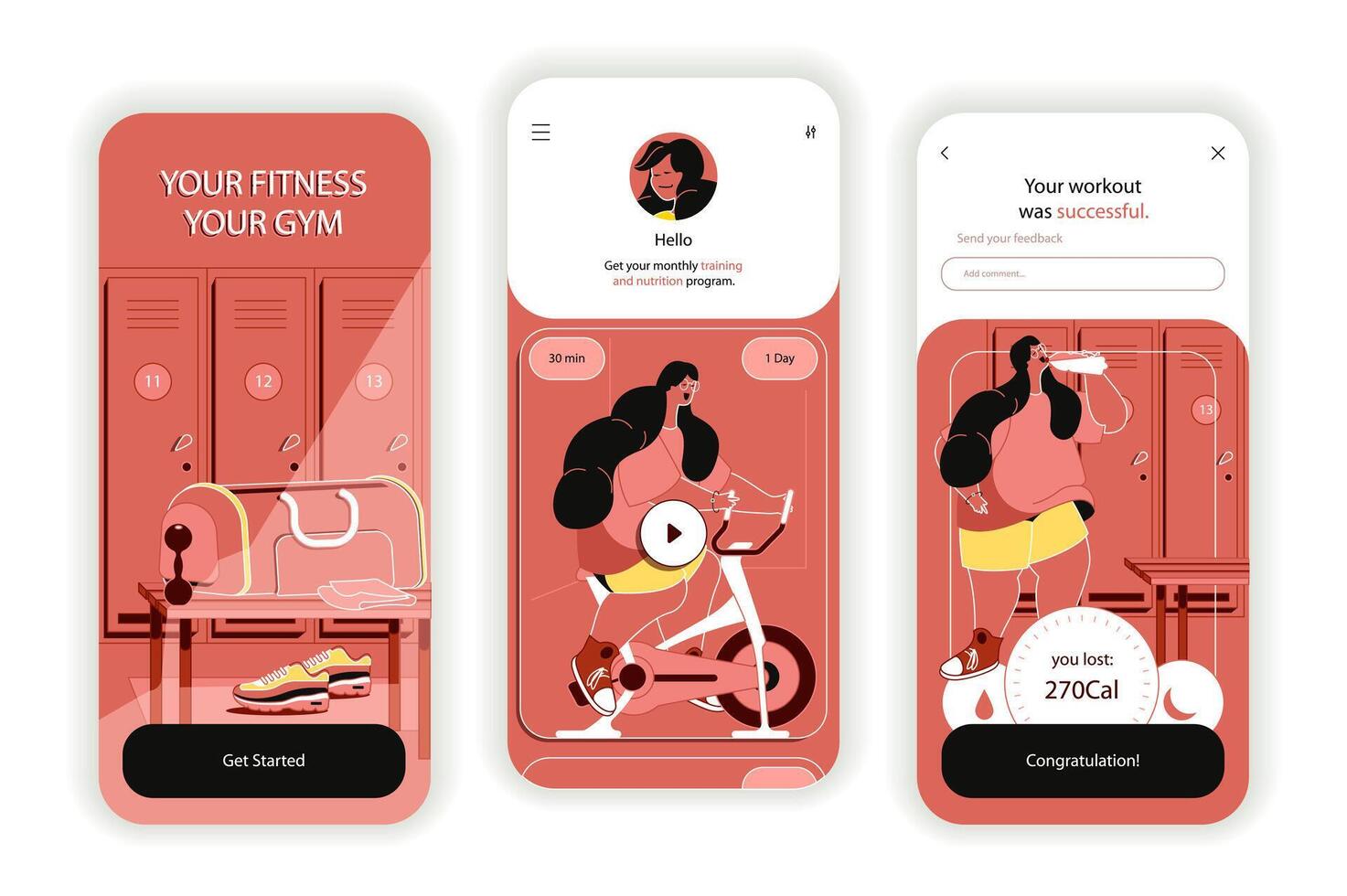 Fitness gym concept onboarding screens. Cardio training and exercises on simulators, healthy lifestyle. UI, UX, GUI user interface kit with flat people scene. illustration for web design Pro Vector