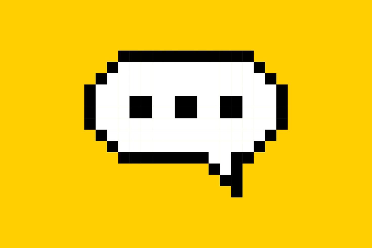 Cute sticker for social networks in pixel style. Call-To-Action speech bubble with ellipsis. 8 bit element on a yellow background. Pro Vector