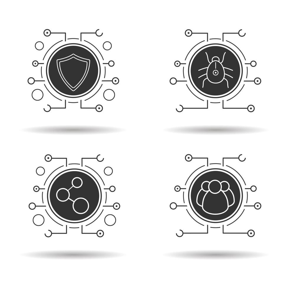 Cyber security icons set. Digital connections, virus program, user group, cyber security. Vector white illustrations in black circles Pro Vector