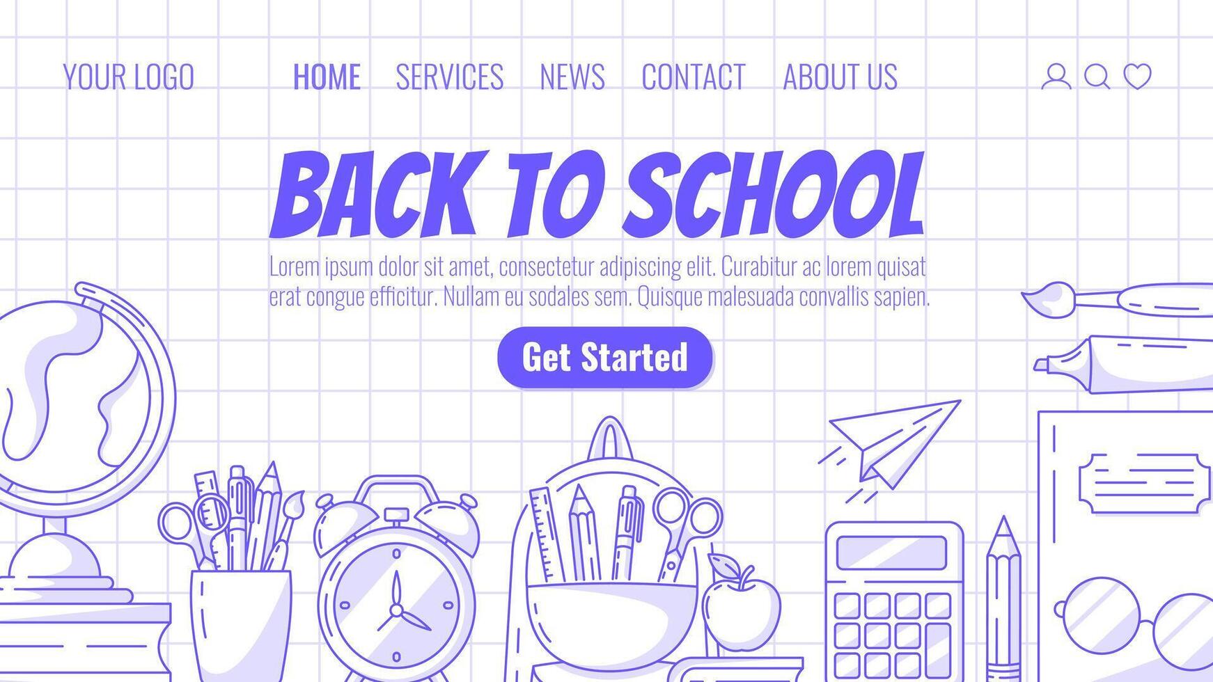 School supplies website template. Globe with books, apple, backpack with stationery, paper airplane, calculator, alarm clock, notebook and glasses. For web, landing page. Checkered background Pro Vector