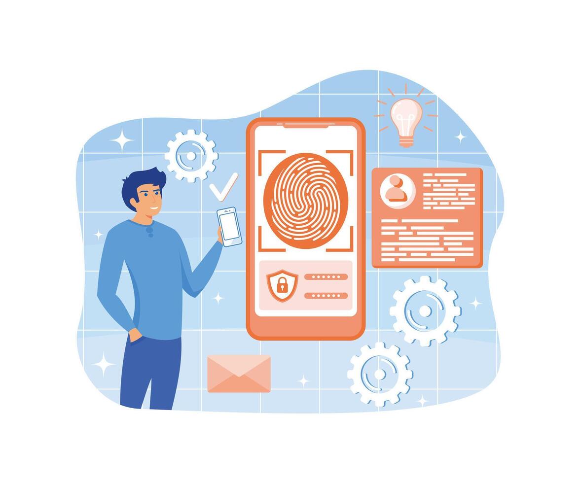 Face recognition system development online service or platform. Facial biometric authentication, identification. Mobile app. flat modern illustration Pro Vector