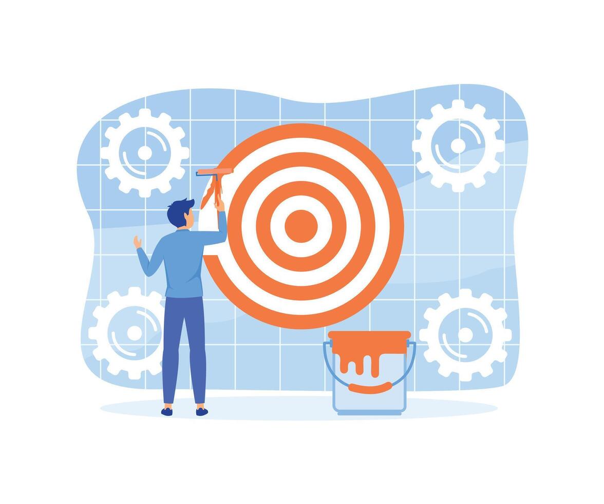 Purpose KPI, key performance indicator or set objective and achievement concept, ambitious businessman on ladder using paint roller to paint big dartboard. flat modern illustration Pro Vector