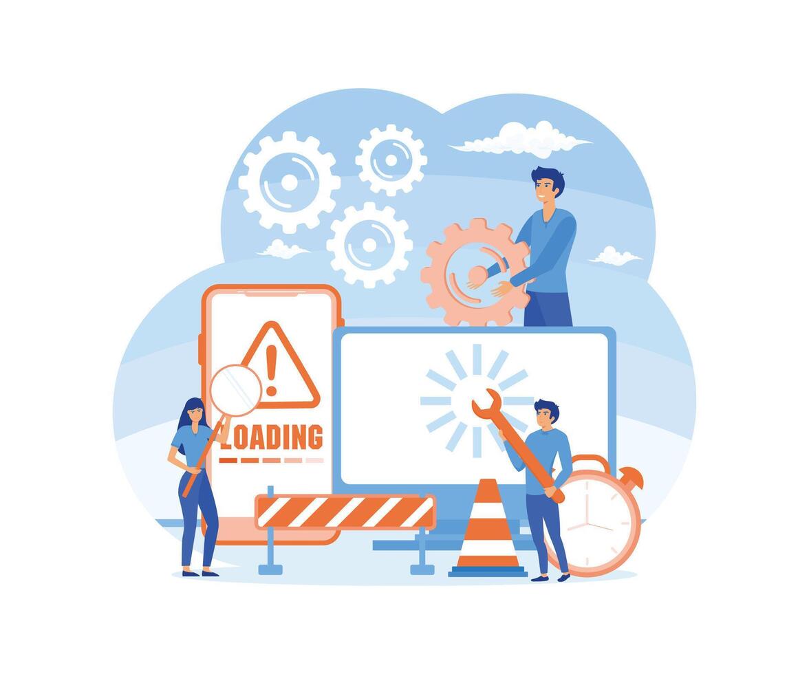 System Update. IT specialists updating software, programs and applications. Technical error and service. Computer, phone screen with updating progress bar. flat modern illustration Pro Vector