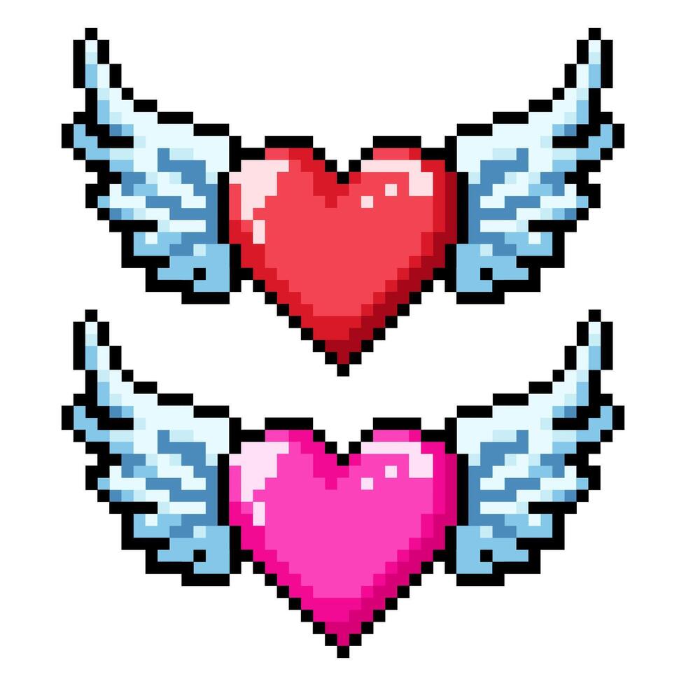 Set pixel heart icon with wings. Arcade game icon. 8 bit sign. Abstract red and pink heart. Pro Vector