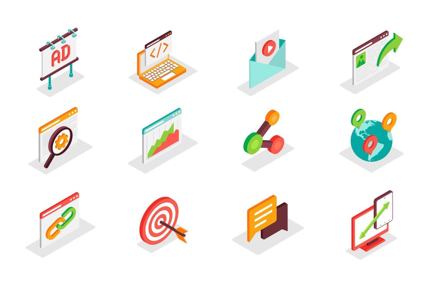 SEO and Marketing concept 3d isometric icons set. Bundle elements of advertising, optimization, content, link, settings, data analysis, traffic and other. illustration in modern isometry design Pro Vector