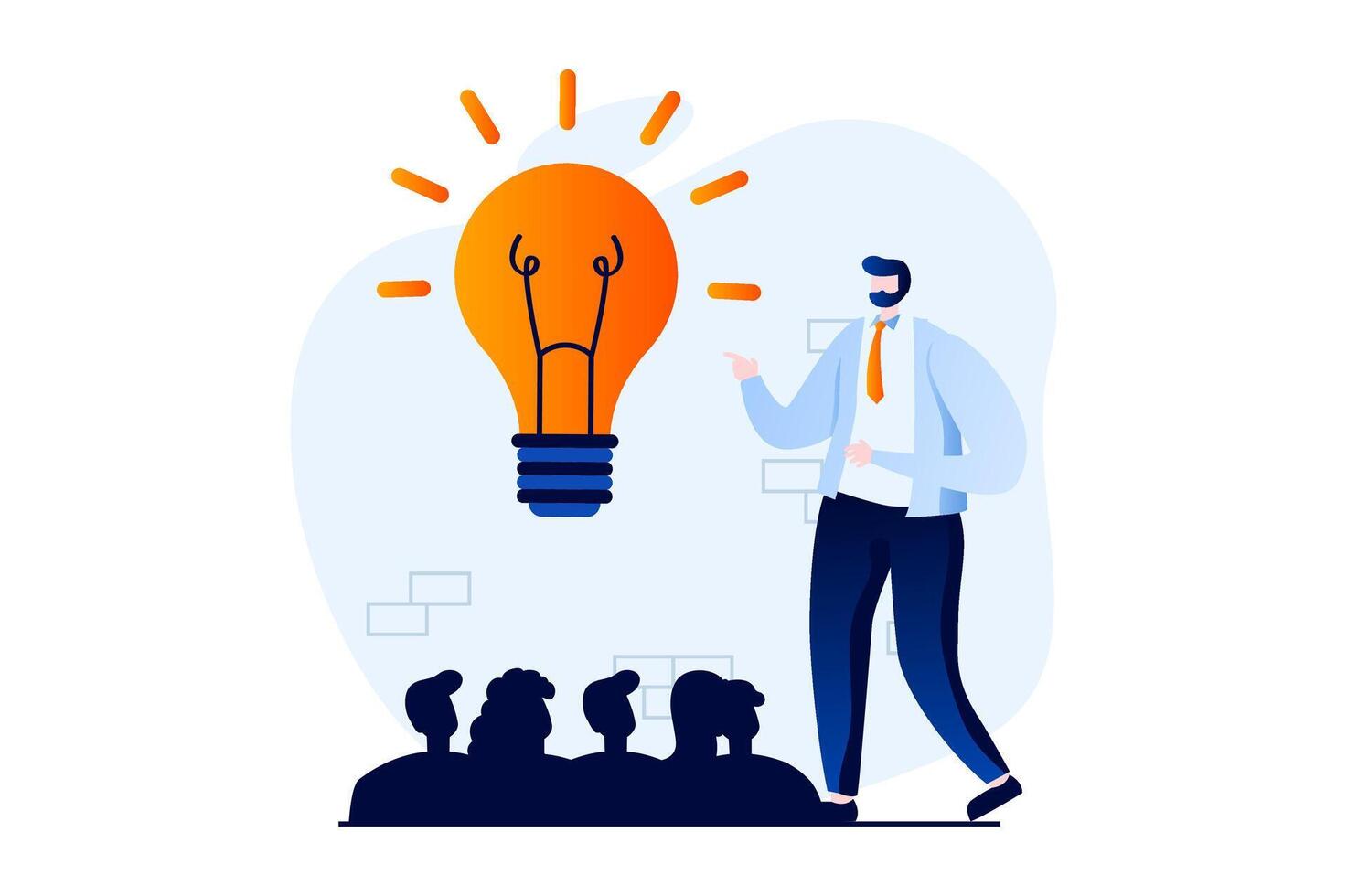 Finding solution concept with people scene in flat cartoon design. Man generates new ideas and brainstorming at conference, communication and collaboration. illustration visual story for web Pro Vector