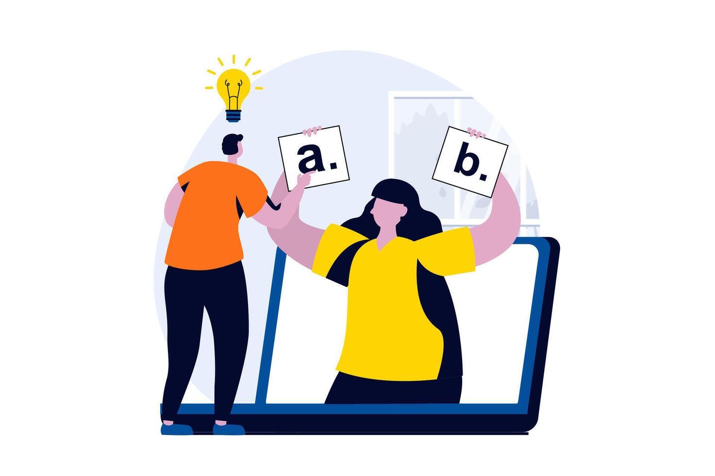 Online survey concept with people scene in flat cartoon design. Man takes online exam or sociological quiz and answers choosing from different options. illustration visual story for web Pro Vector
