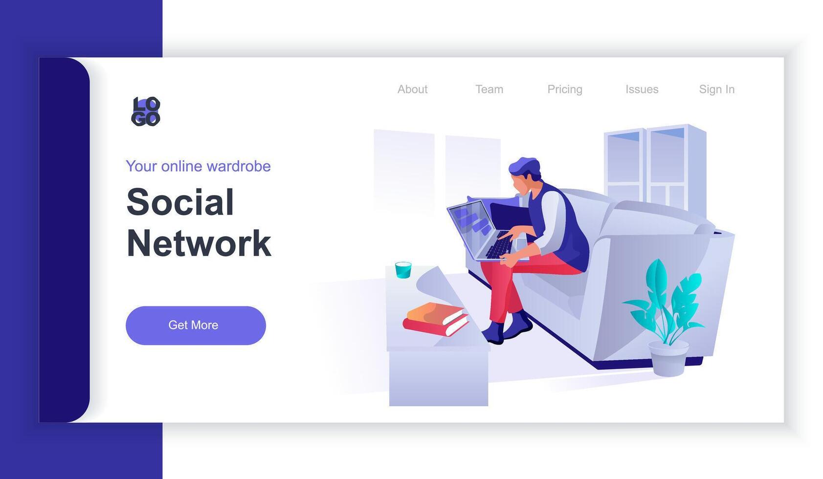 Social network concept 3d isometric web banner with people scene. Man communicates online, chatting with friends and browsing using laptop. illustration for landing page and web template design Pro Vector