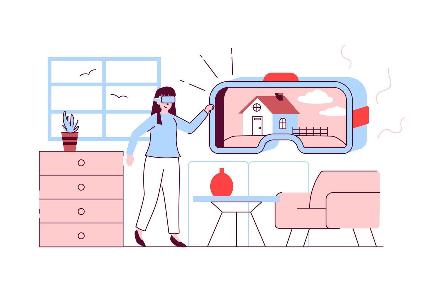 Augmented reality concept in flat line design. Woman using VR headset for working with graphic projection of house at architectural project. illustration with outline people scene for web Pro Vector