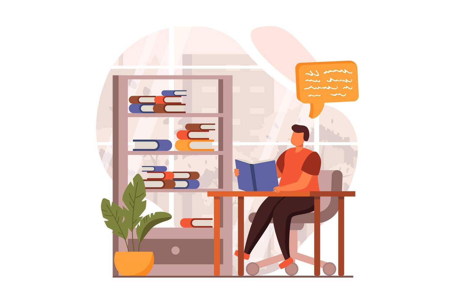 People reading book web concept in flat design. Student studies from textbook and prepares for exam while sitting at table in library. School education. illustration with characters scene Pro Vector