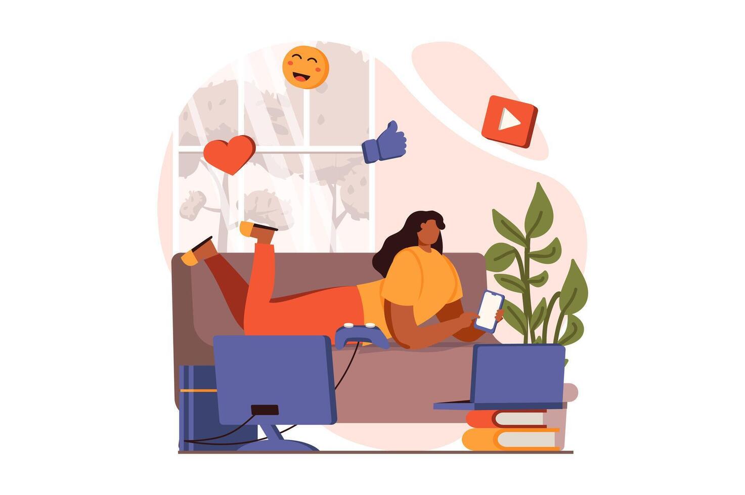 People sit in gadgets web concept in flat design. Happy woman browsing, chatting and scrolling feed in apps using smartphone, spending lot of time online. illustration with characters scene Pro Vector