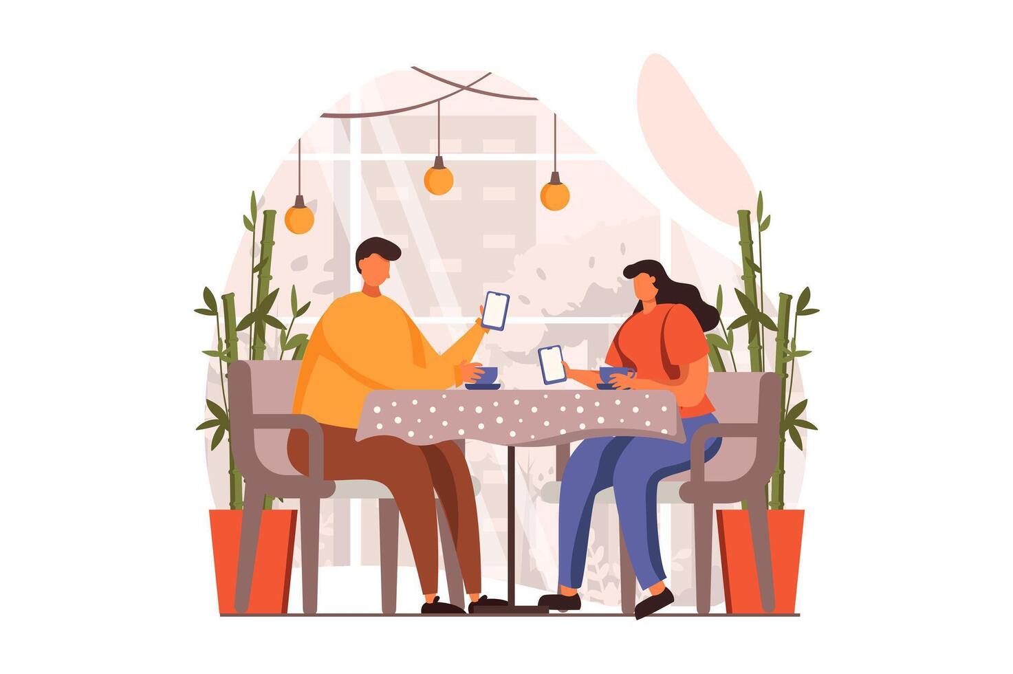 People sit in gadgets web concept in flat design. Man and woman scroll feeds and look at smartphones, ignoring each other while sitting at table in cafe. illustration with characters scene Pro Vector
